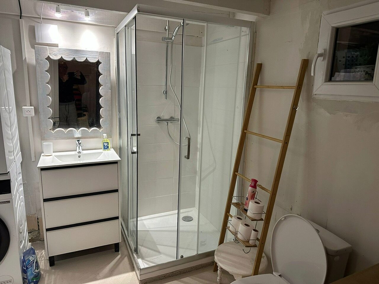 Studio indépendant de la maison = couchage 140 x 190, cabine de douche, meuble lavabo, miroir, wc, meuble évier, lave-linge et sèche-linge, Nespresso, bouilloire, frigidaire (pas de cuisine possible).