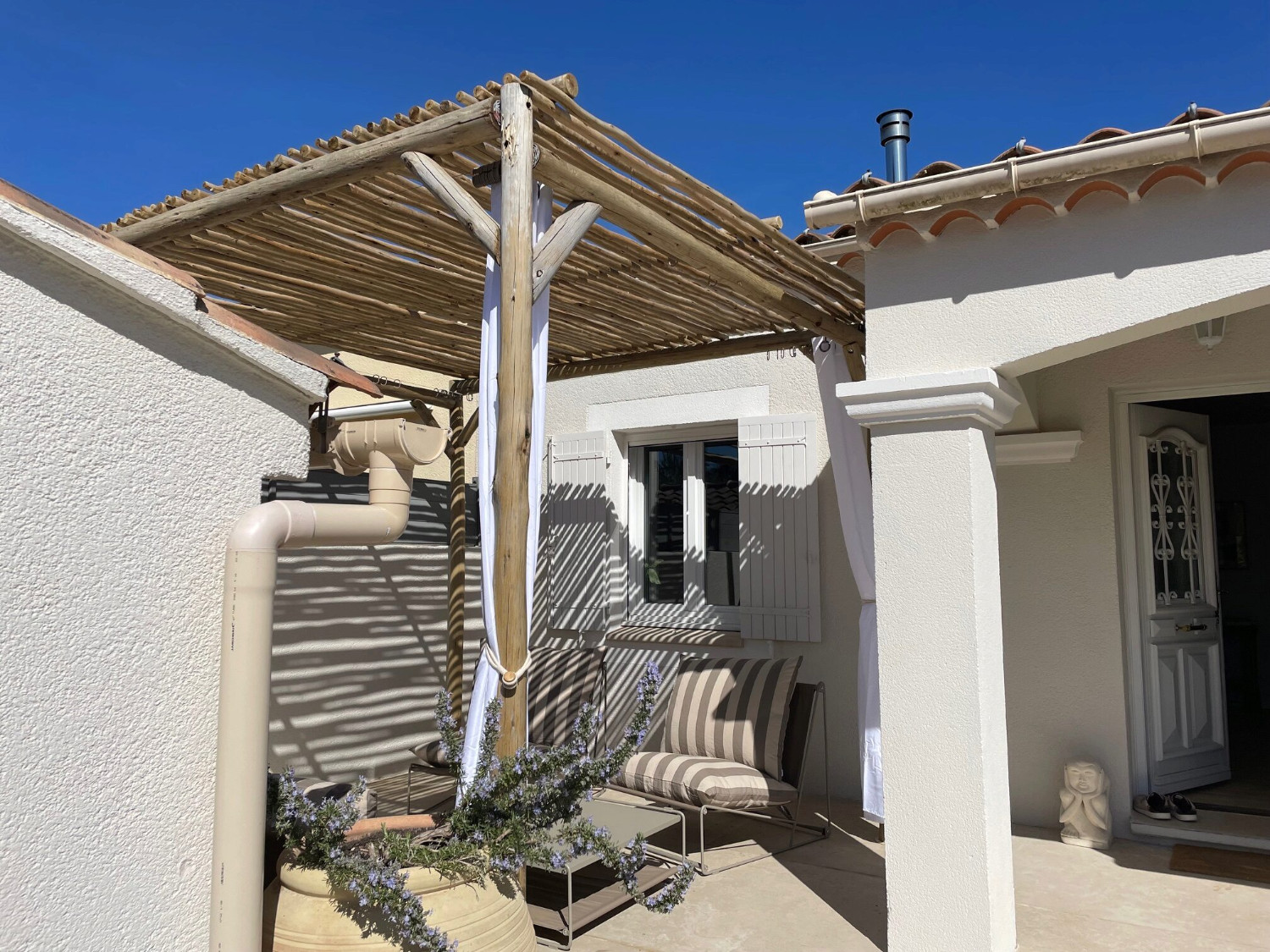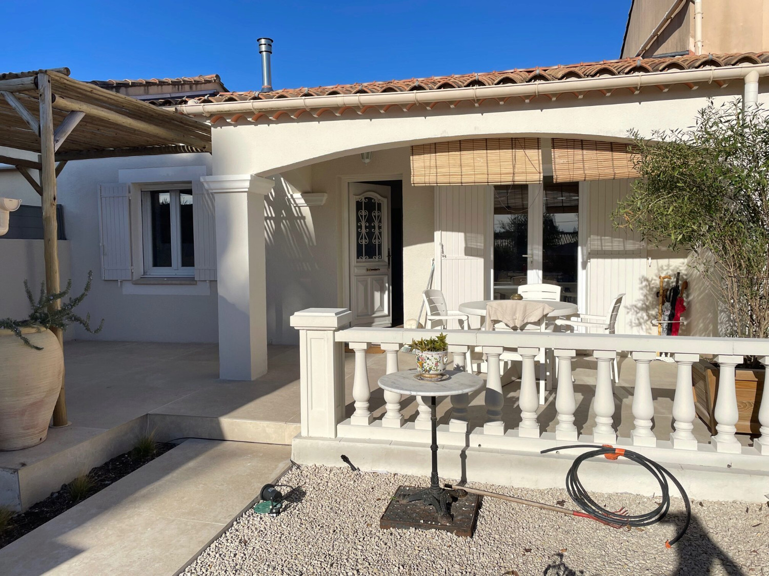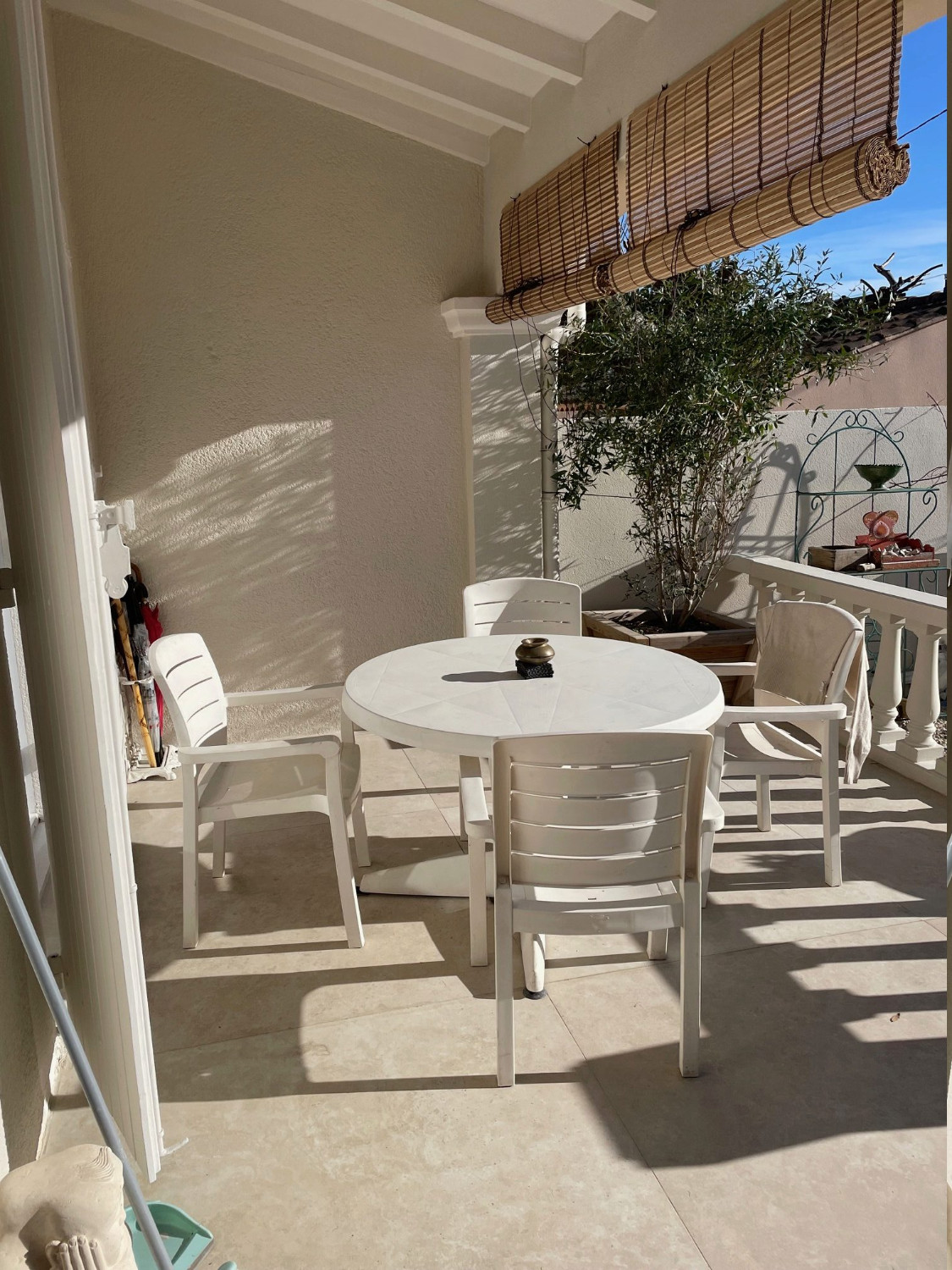 - Une terrasse couverte sous toiture avec table ronde à manger + 4 fauteuils