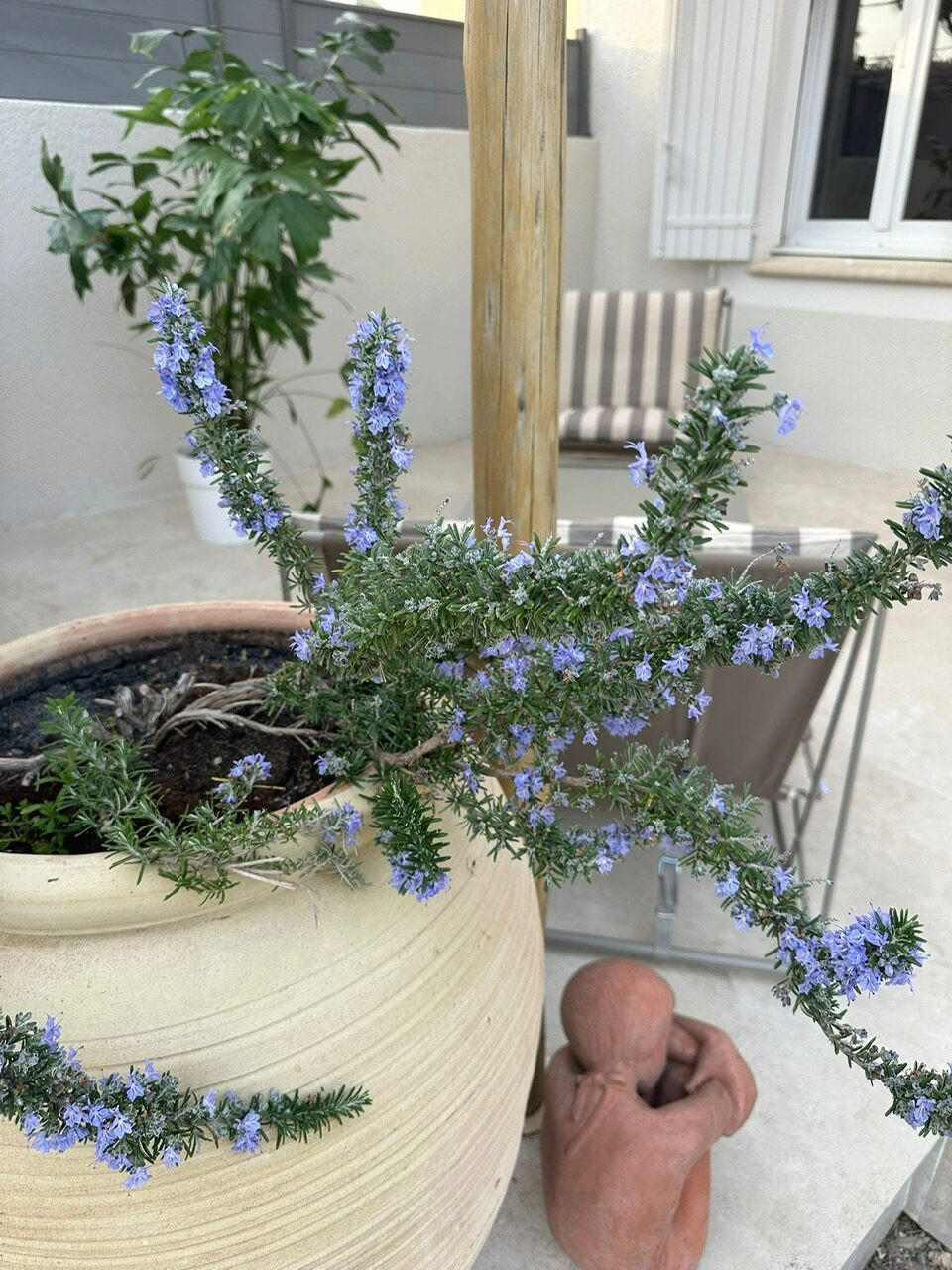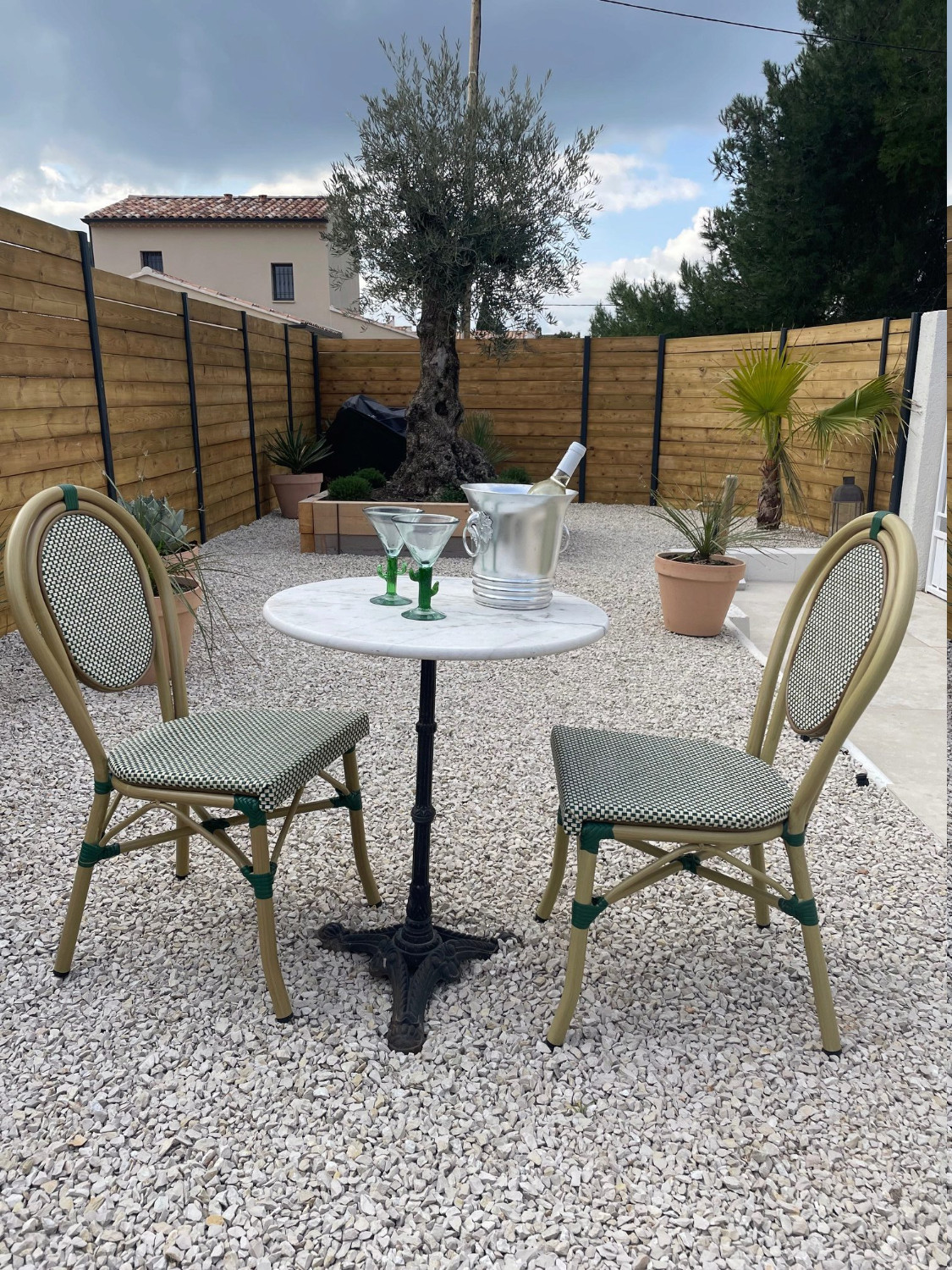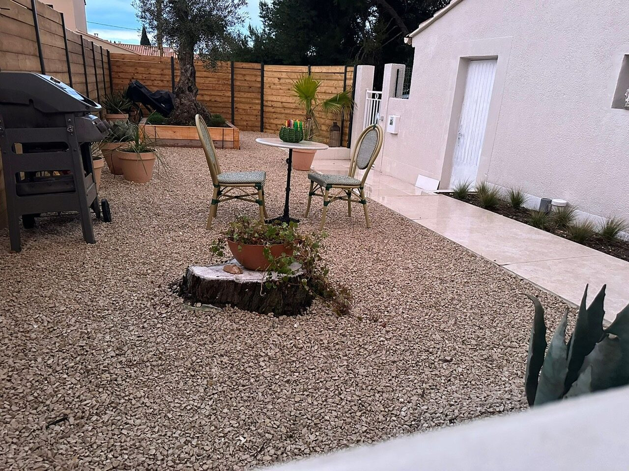 - Une terrasse couverte sous toiture avec table ronde à manger + 4 fauteuils