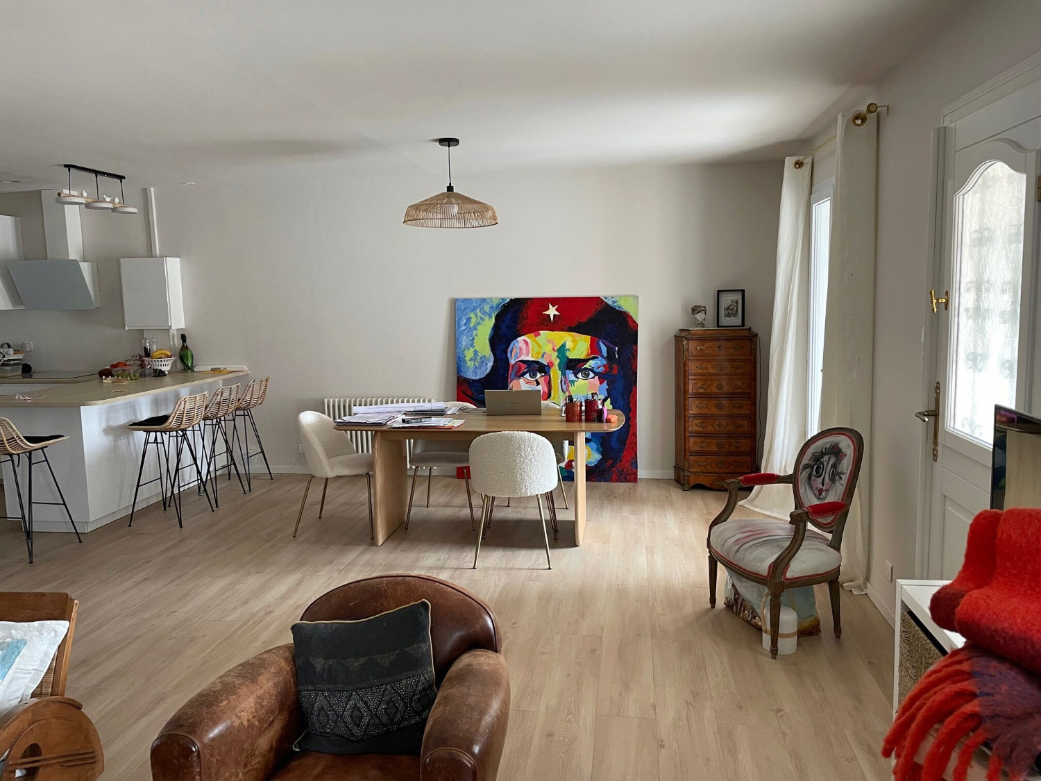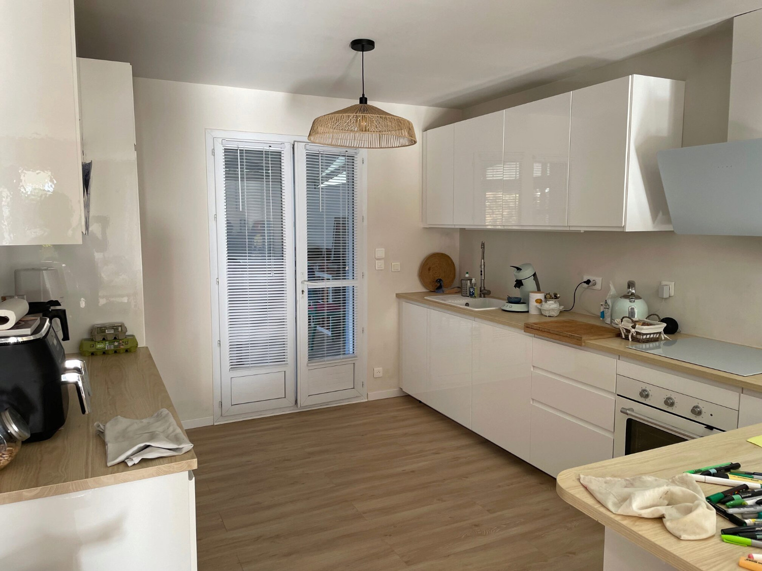 Maison = Grande pièce à vivre salon séjour + 40m² donnant sur cuisine équipée (robot cuiseur Moulinex, cafetière Senseo, Sodastream, bouilloire, grille-pain, lave-vaisselle, plaques/four/hotte électriques, réfrigérateur/congélateur)