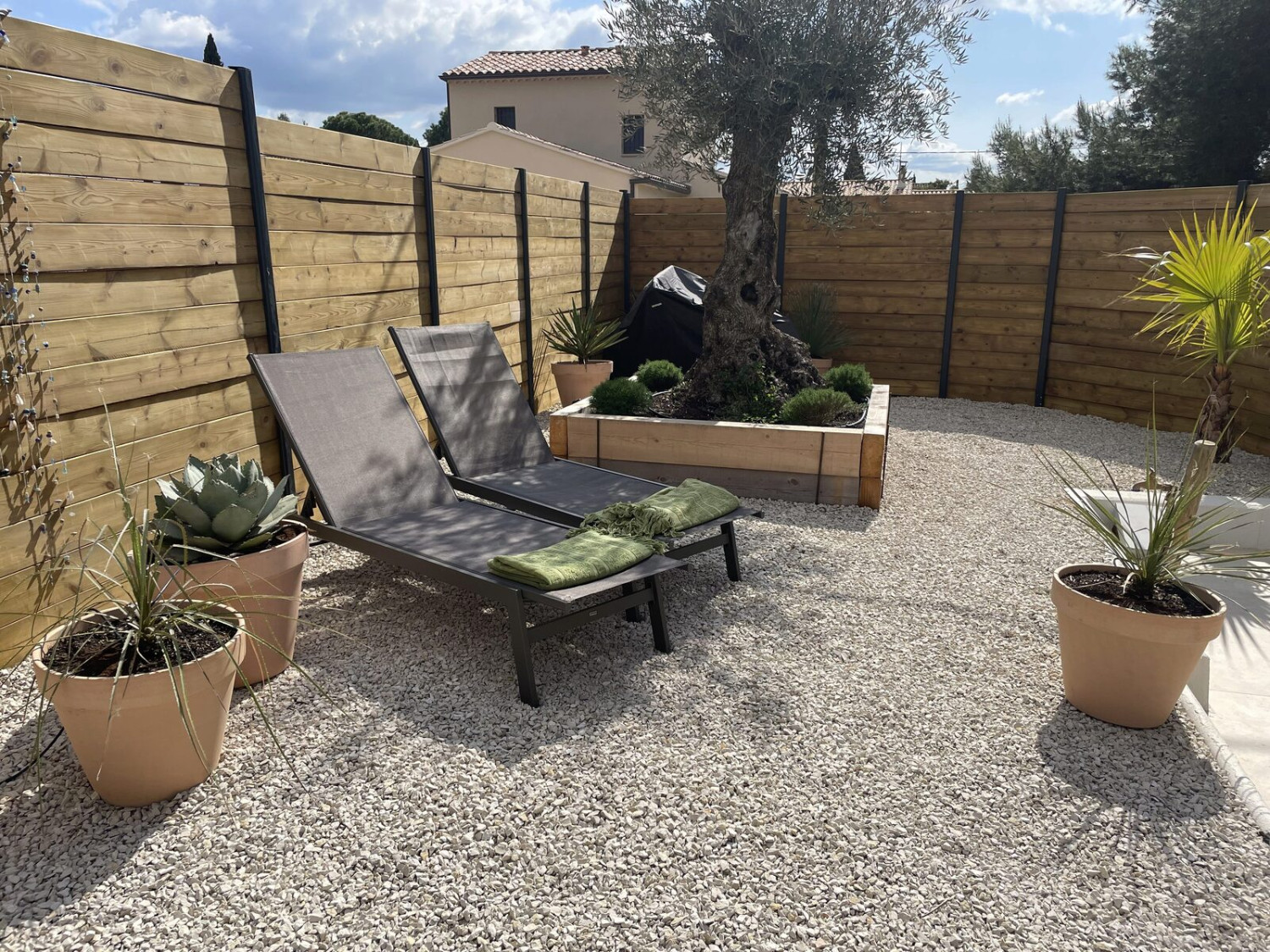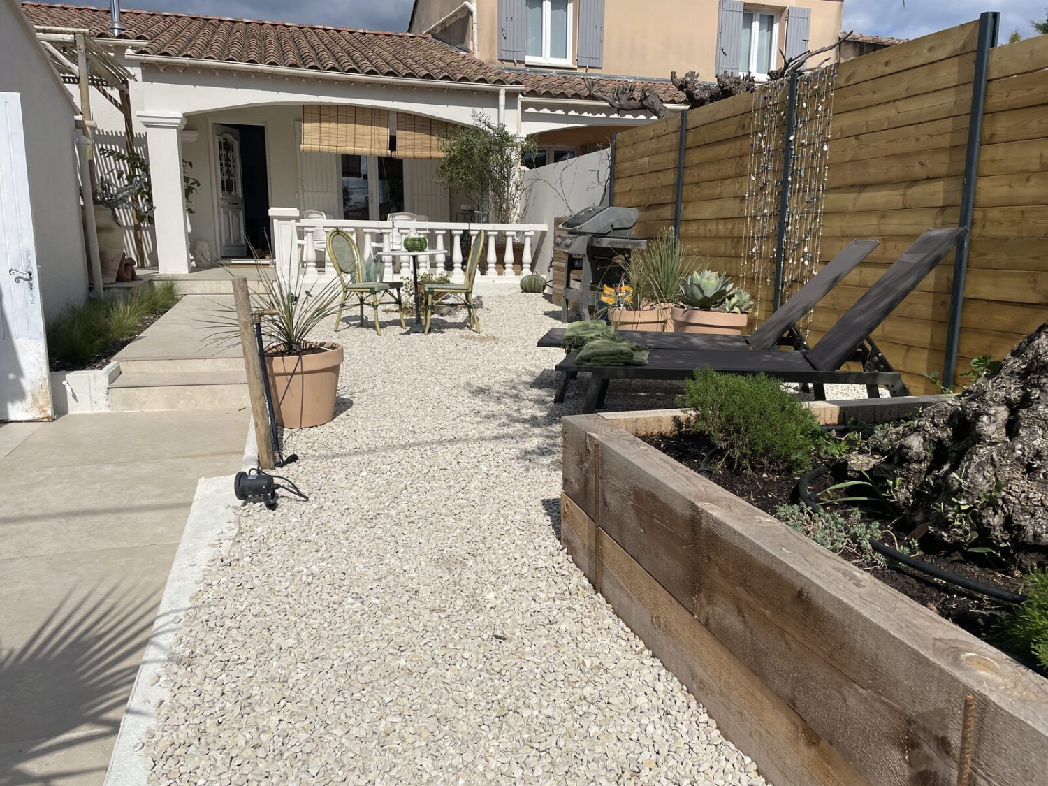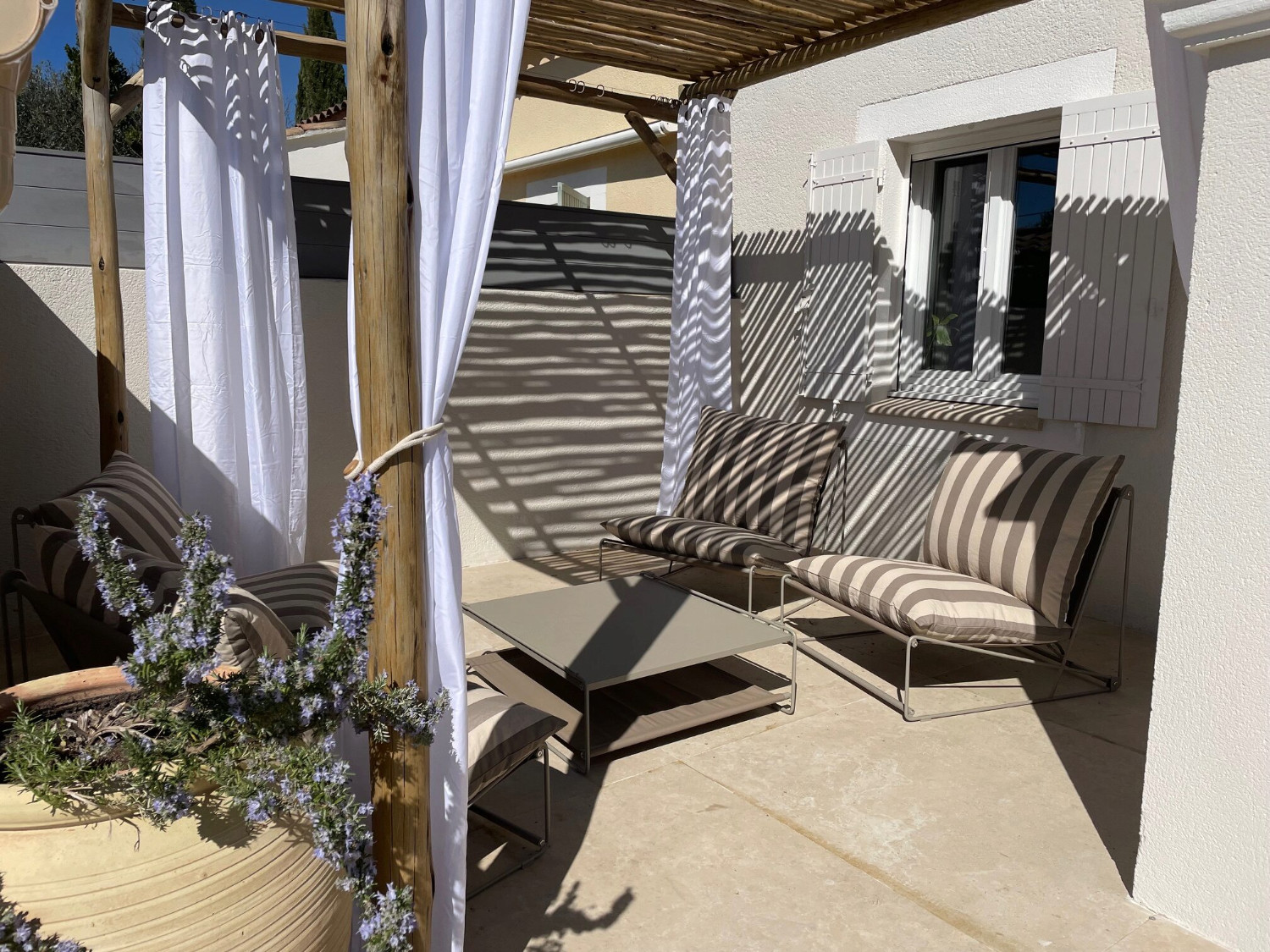 - Une terrasse couverte par pergola bois avec salon de jardin 4 places (4 grands fauteuils et 1 table basse)