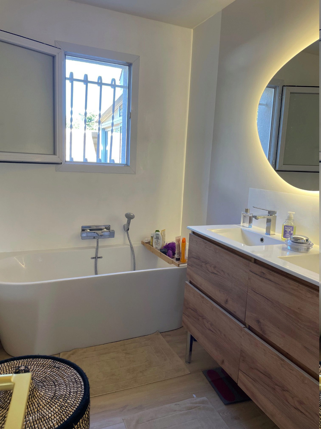 - Salle de bains avec fenêtre côté nord = baignoire, doubles vasques sur meuble 4 tiroirs, sèche-cheveux, sèche-serviettes, grand miroir